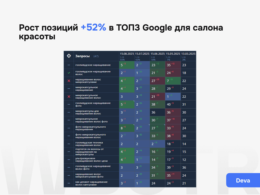 Продвигаем сайты салонов красоты и проектов в сфере эстетики, где особенно важны доверие, локальная видимость, репутация специалистов и сильные коммерческие посадочные. Прорабатываем структуру услуг, мастеров, направлений, локаций, прайса и информационных материалов так, чтобы сайт собирал целевой спрос, усиливал доверие к бренду и приводил записи из органического поиска.