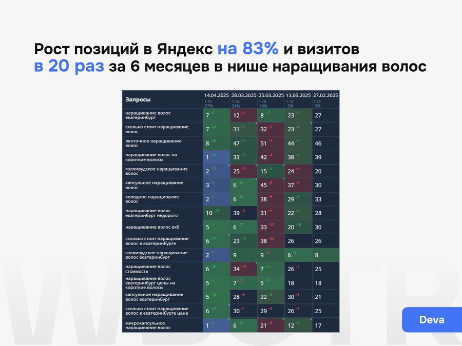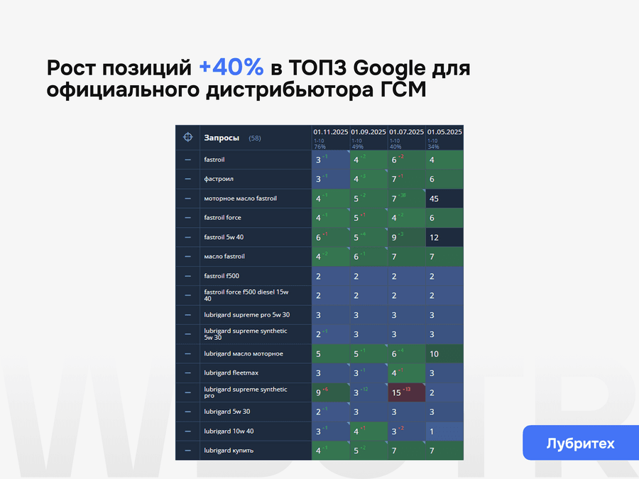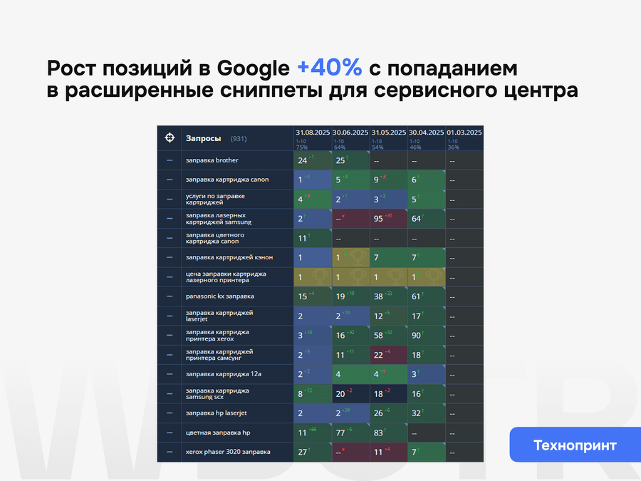 Когда видим, какие страницы, кластеры и разделы дают лучший прирост, масштабируем именно их: расширяем структуру дальше, запускаем новые посадочные и усиливаем соседние сегменты спроса. Так сайт растёт не точечно, а как система, которая постепенно охватывает всё больше органического спроса.