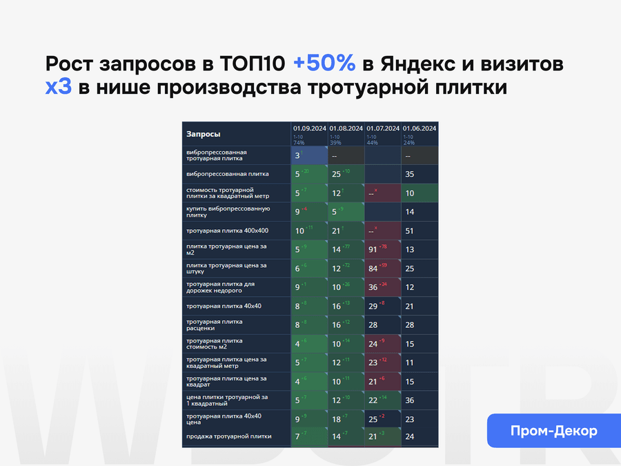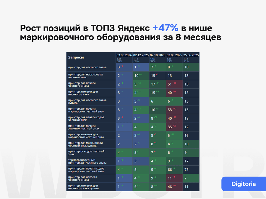 Продвижение по позициям сфокусировано на росте конкретных запросов в выдаче. Продвижение по трафику работает шире: задача не просто поднять часть ключевых фраз, а увеличить общий объём целевого органического трафика, число страниц входа и долю небрендовых переходов. Такая модель лучше подходит для проектов, где важен системный рост SEO-канала, а не точечное движение по ограниченному списку запросов.