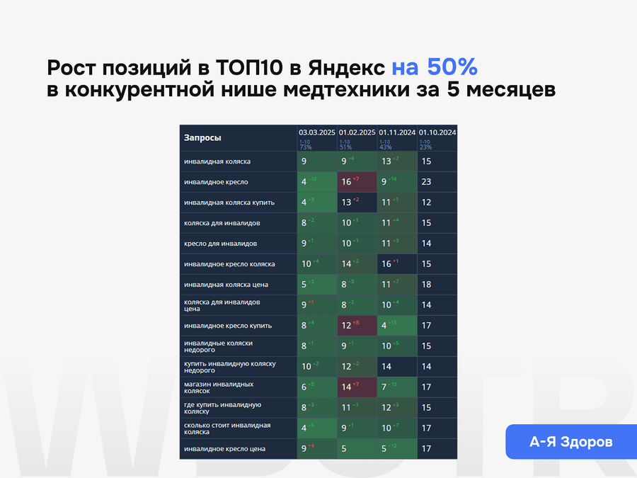 Продвигаем медицинские сайты с учетом повышенных требований к достоверности, экспертности и доверию со стороны поисковых систем и пользователей. Прорабатываем структуру услуг, страницы врачей, направления лечения, информационные материалы и доверительный контур сайта так, чтобы проект лучше ранжировался по целевым запросам, усиливал E-E-A-T сигналы и приводил обращения без потери качества трафика.